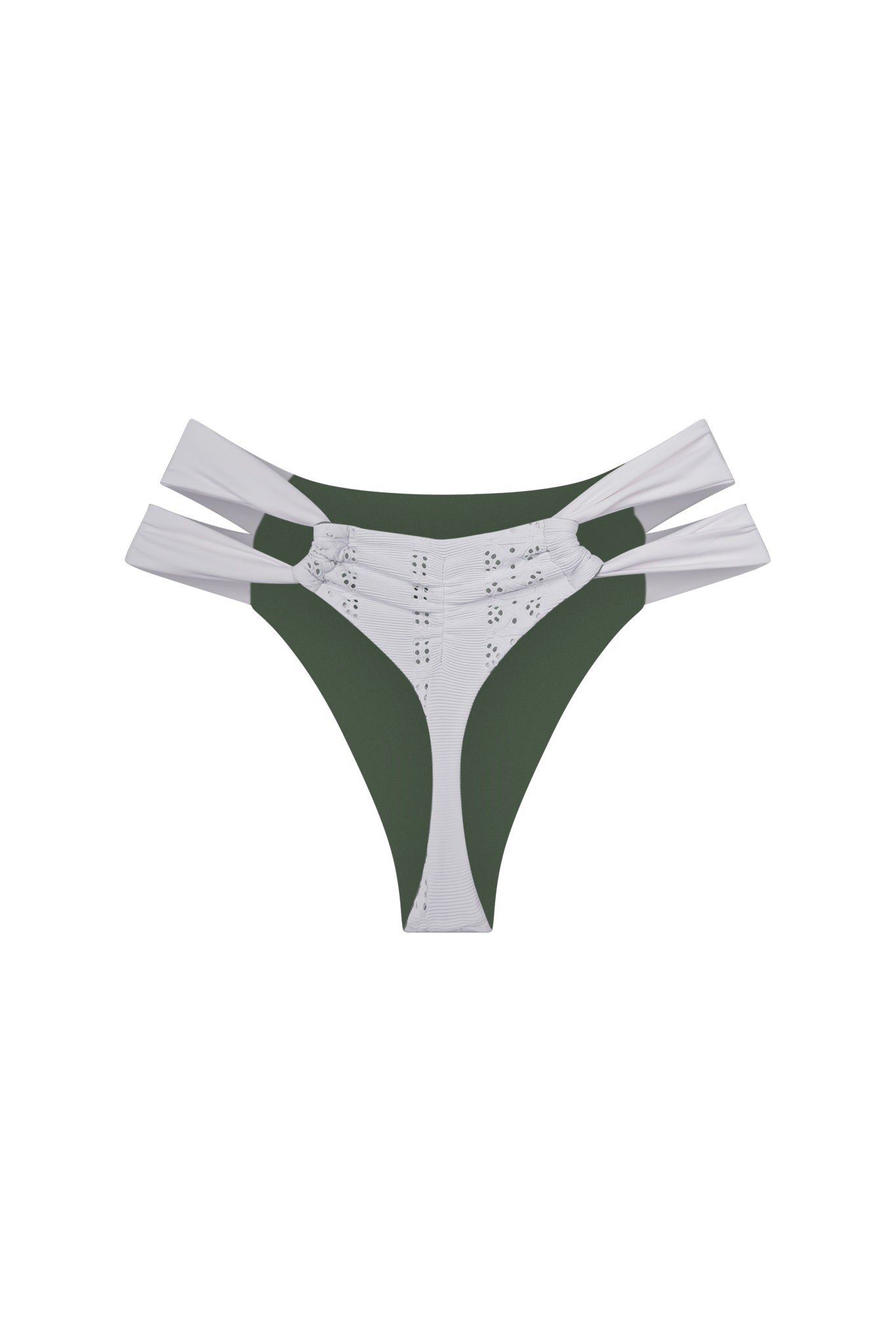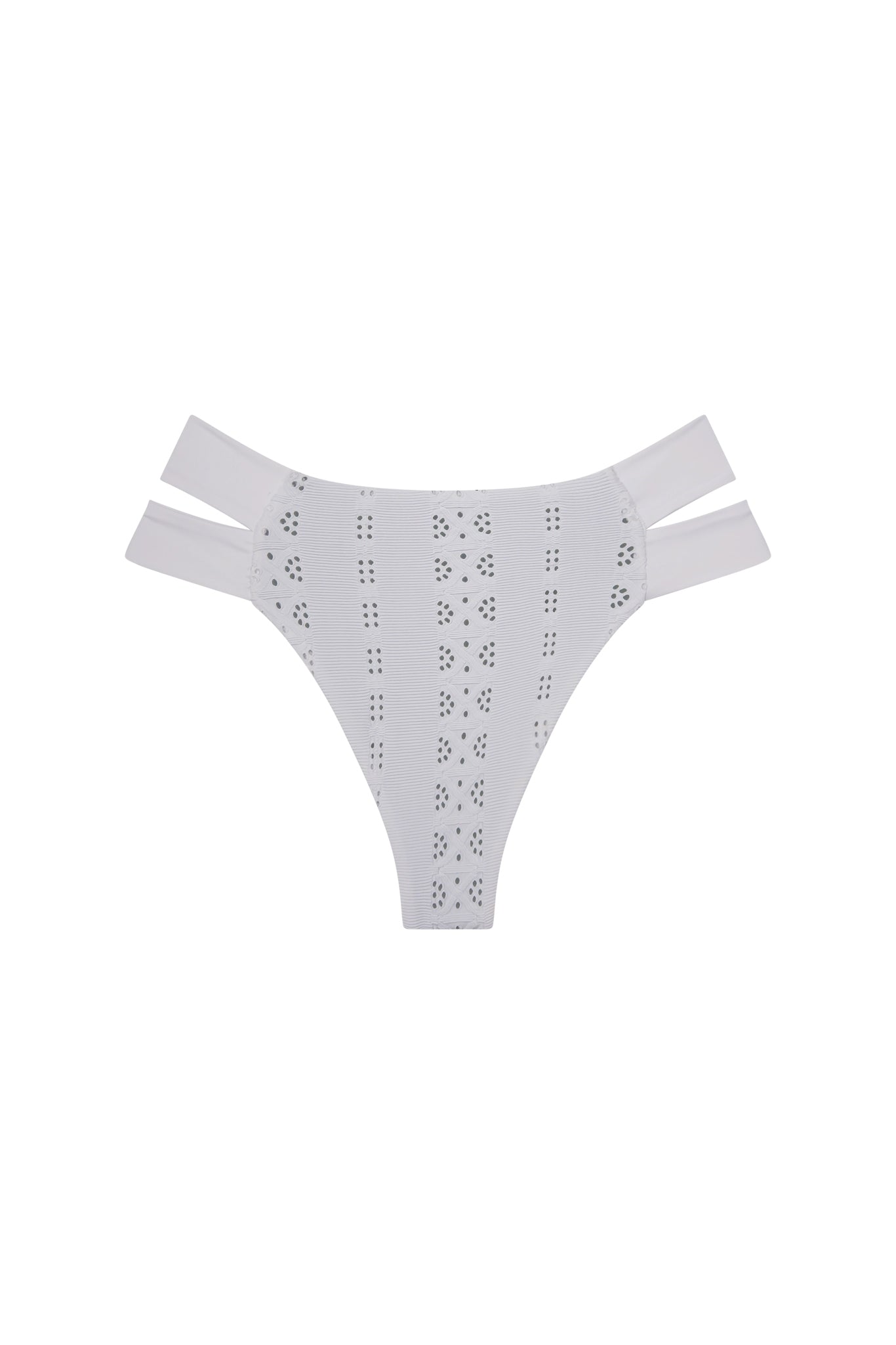 The Navagio Bikini Bottom is a mid-rise style designed in a delicate perforated fabric that reveals a hint of the inner color. Finished with soft elastic side straps, this piece is both flattering and comfortable.