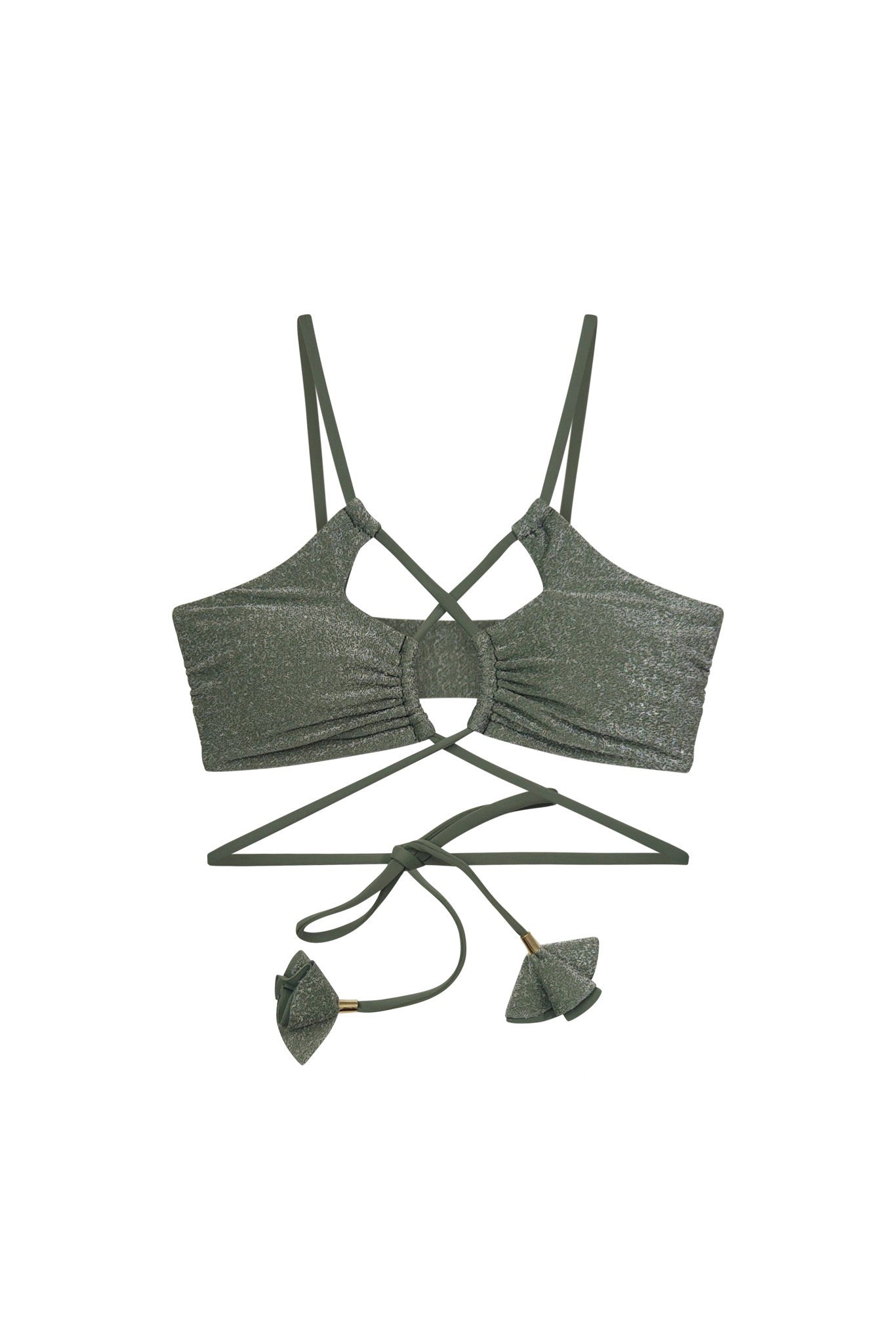 Adjustable & Effortlessly Chic, Shine with confidence in our Capri Crisscross Bikini Top, crafted in a stunning metallic sage green fabric that catches the light and highlights your glow.